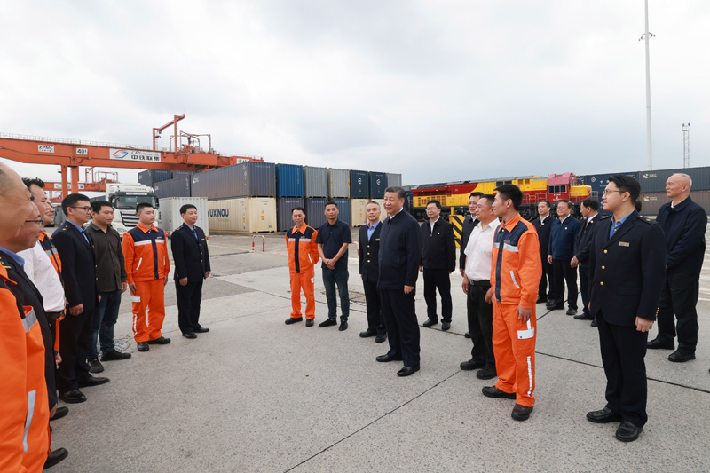 4月22日至24日,中共中央总书记、国家主席、中央军委主席习近平在重庆考察。这是22日下午,习近平在重庆国际物流枢纽园区重庆铁路集装箱中心站,同货车司机、列车司机、装卸工人、场站管理人员等亲切交流。新华社记者 岳月伟 摄